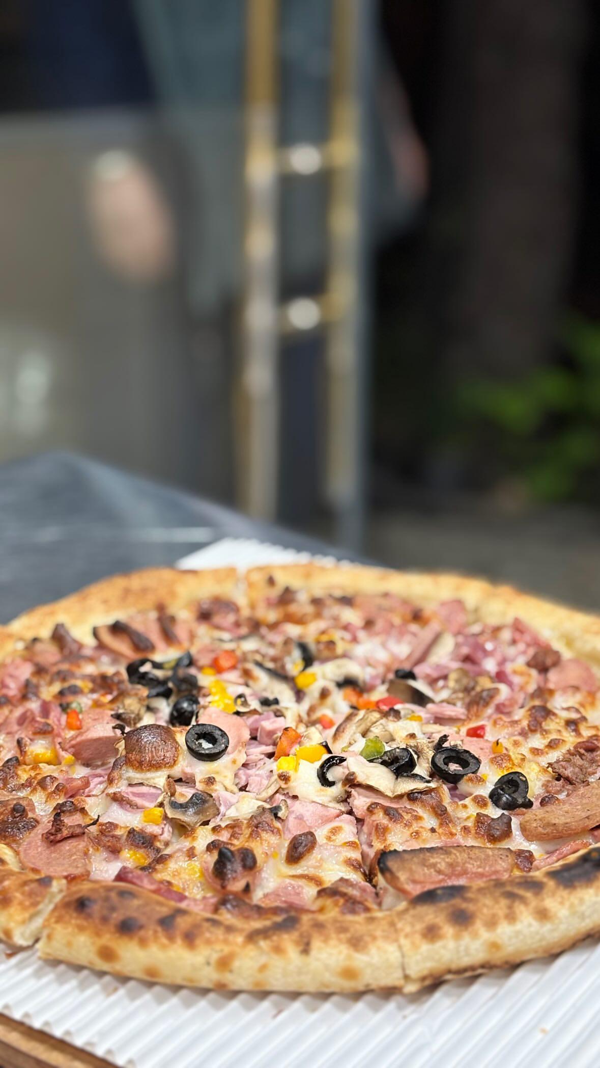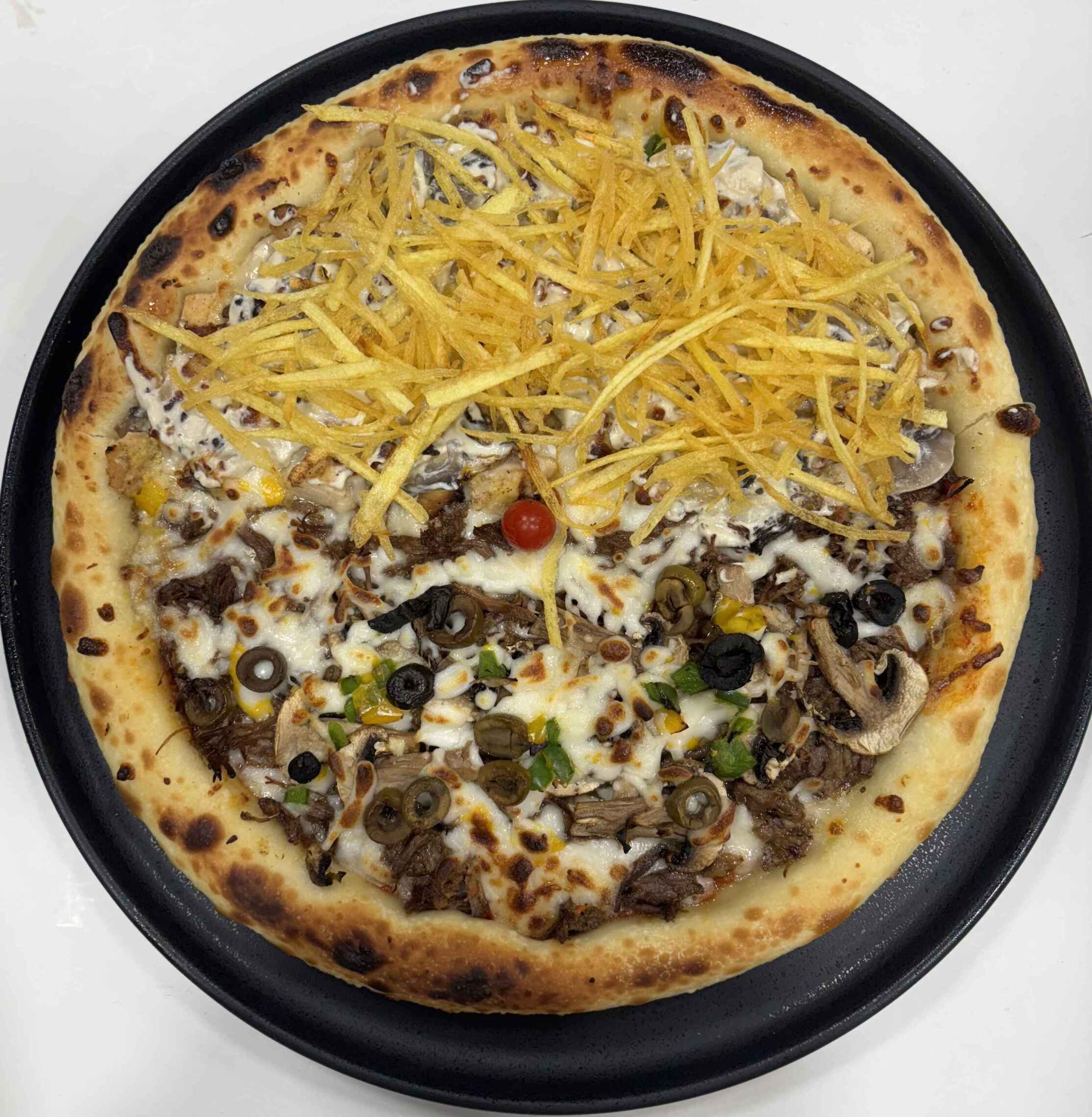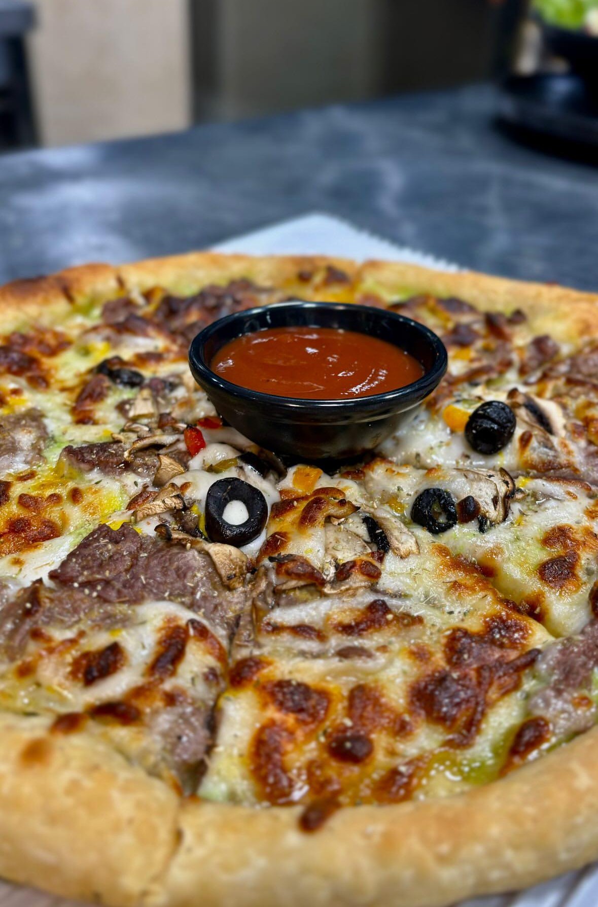 سس مارینارا، گوشت رستبیف مزهدار گوساله، پنیر، قارچ، فلفل دلمهای، زیتون