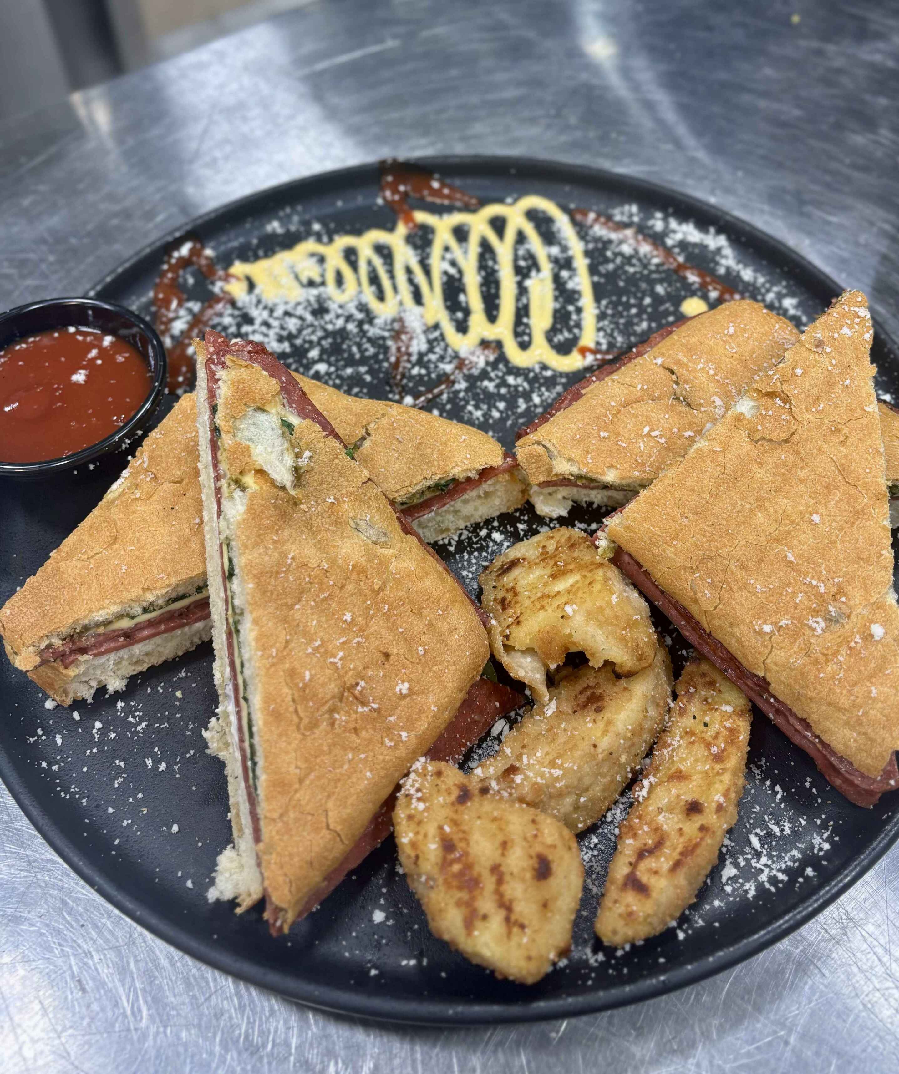 بیکن گوشت، نان چاباتا، دیپ پارمسان، دیپ پستو، ریحان، اسفناج، سیبتنوری مخصوص، پنیر پارمسان