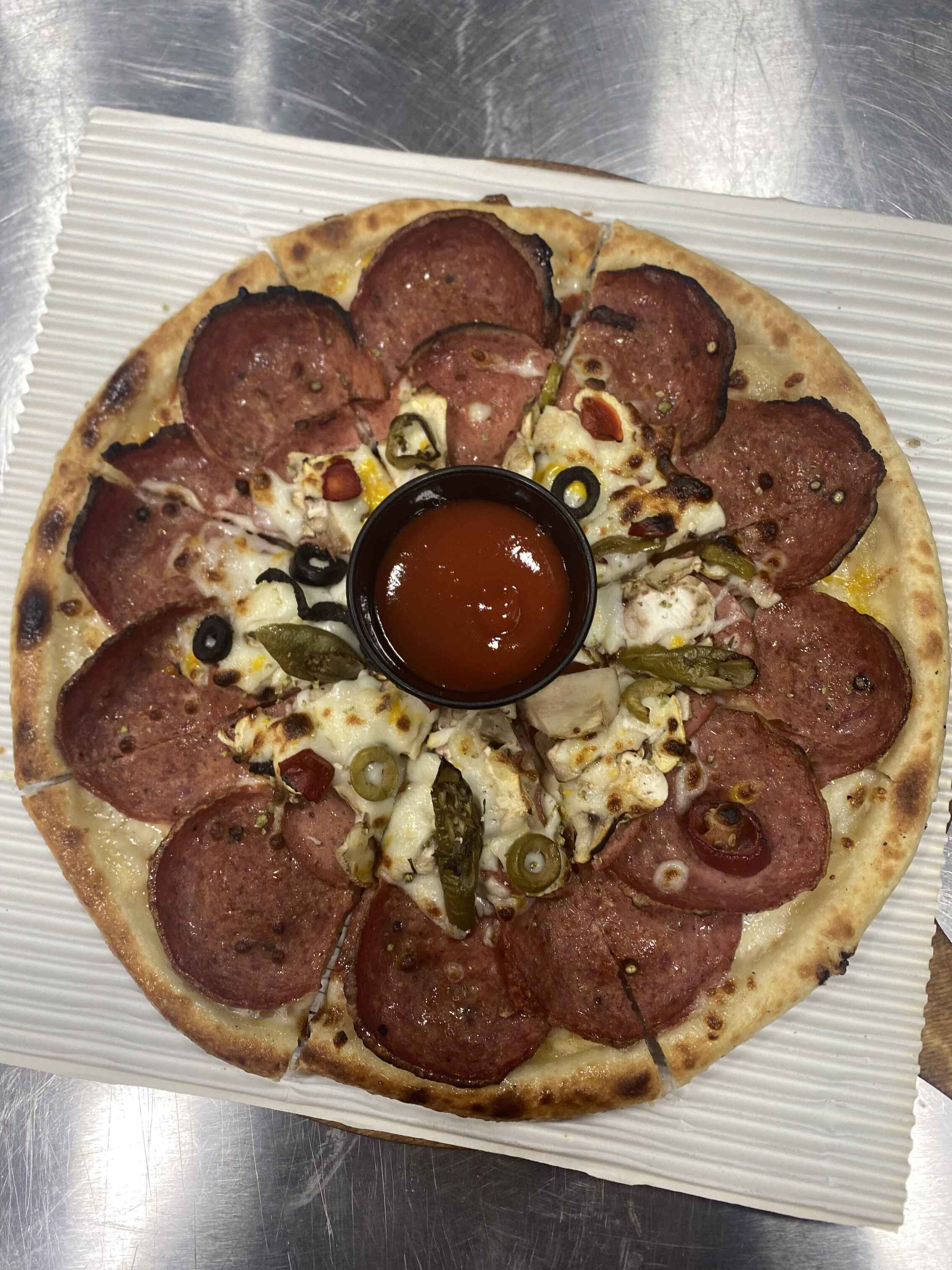 پپرونی، نان چاباتا، پنیر موزارلا، دیپ پستو، دیپ پارمسان، ریحان، اسفناج، سیب تنوری، پنیر پارمسان