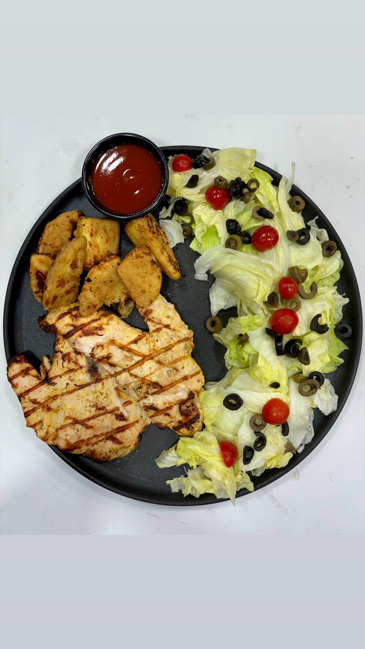 سینه مرغ گریل، کاهو، گوجه گیلاسی، زیتون، قارچ گریل، سیبزمینی تنوری، سس گرین