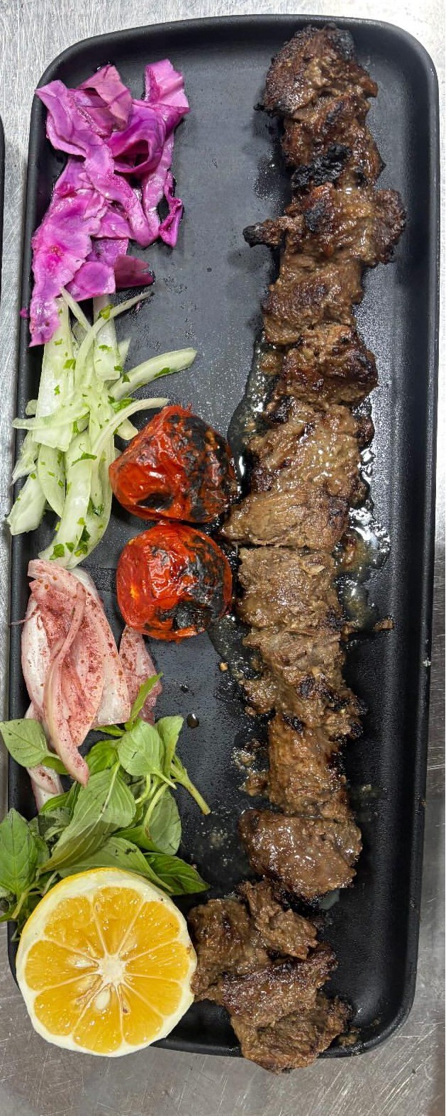 گوشت گوساله رستبیفشده، نان چاباتا، دیپ پستو، ریحان، اسفناج، دیپ پارمسان، سیبزمینی تنوری، پنیر پارمسان