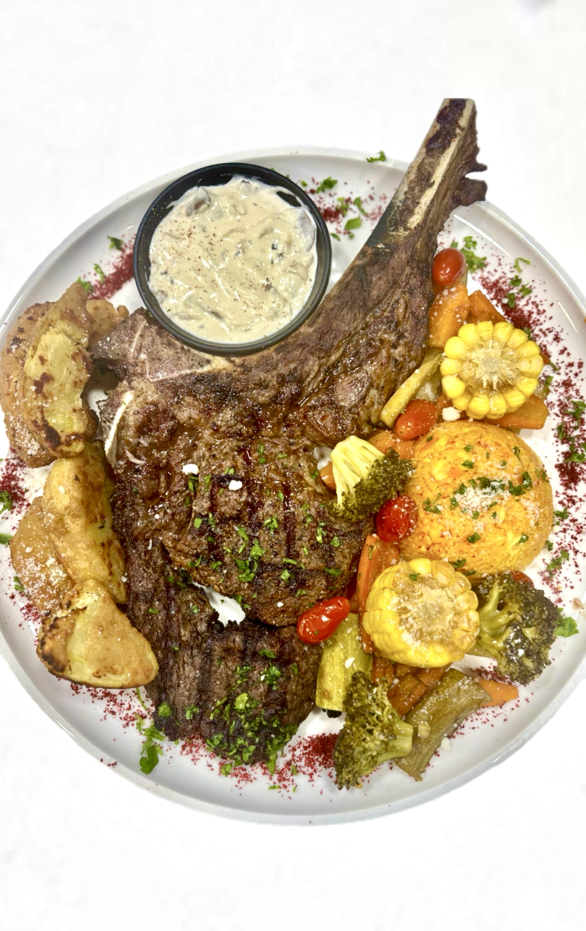 ۴۵۰ گرم فیله گریل شده، همراه با سبزیجات، قارچ تازه، سیب زمینی تنوری، سس قارچ، پنیر پارمسان